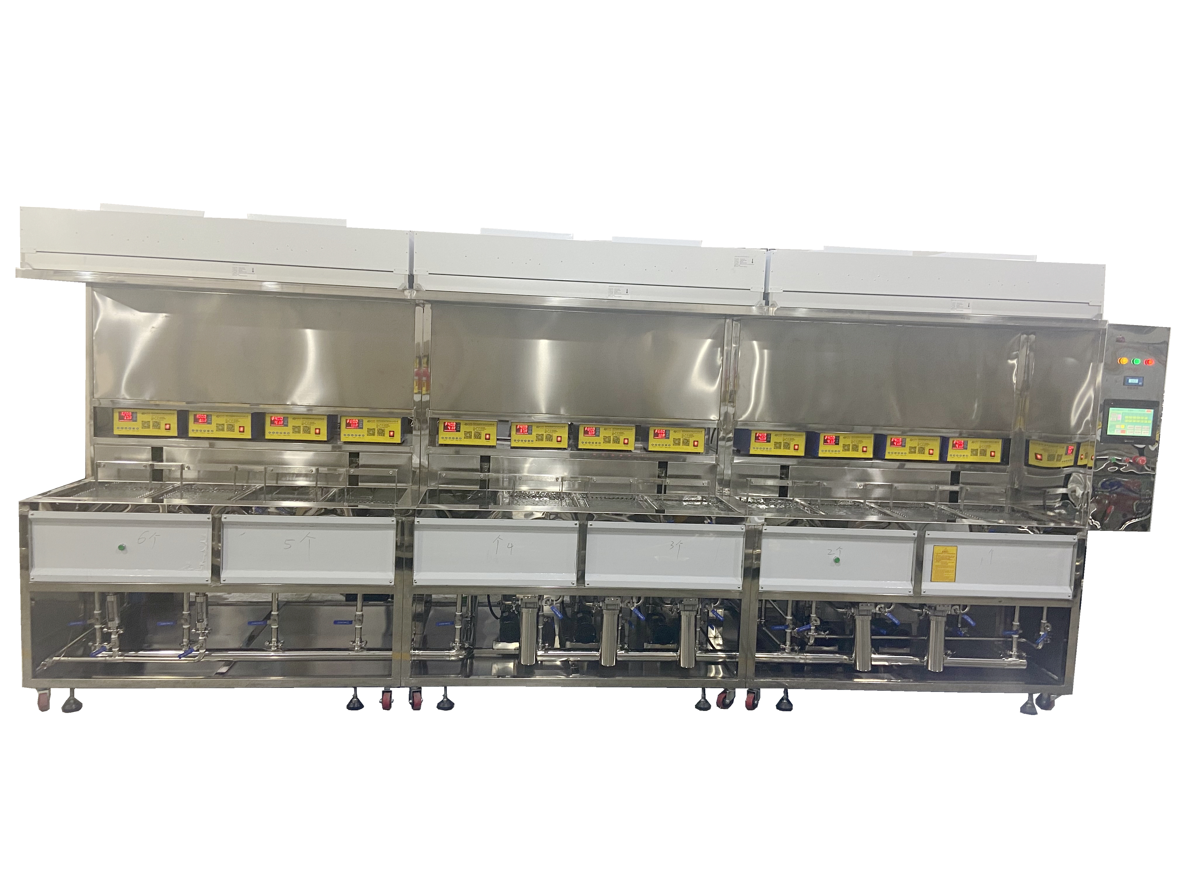 優勢:每個槽功能獨立,專液專用。含有清洗劑的臟液不會污染后面的漂洗槽,漂洗后的純凈水也不會被前面的臟液污染。