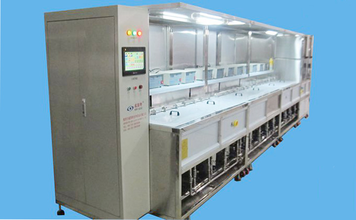 自動上料→洗劑超聲清洗→純水超聲清洗→純水超聲波漂洗→純水超聲清洗→純水超聲清洗→純水超聲波清洗→自動下料。